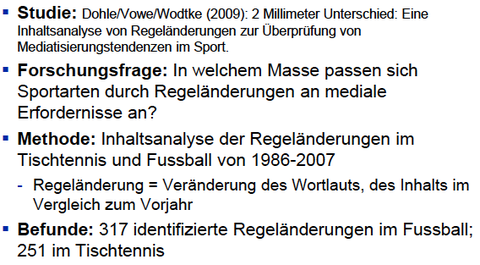 | Medialisierung Medialisierung des Sports Regeländerungen (Dohle/ Vowe/ Wodtke, 2009): Studien, Forschungsfragen, Methoden | |