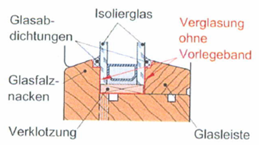 Verglasungssysteme (2) | Es werden verschiedene Verglasungssysteme unterschieden: Verglasung im Kittbett = ausgefüllter Glasfalz Hartverglasung = dichtstofffreier Glasfalz Weichverglasung = dichtstofffreier Glasfalz |