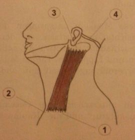 | Großer Kopfwender (m. sternocleidomastoideus) Lage Ursprung Lage Ansatz | Ursprung: äußerer Kopf; Oberkante u. vorderfläche des mittleres drittel Schlüsselbein. (1) mittlerer Kopf; vorderfläche des Brustbeinhandgriff (2) Ansatz: Außenseite Warzenfortsatz am Schläfenbein (3) oberes Nackenband Hinterhauptbein (4) |
