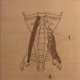 | Treppenmuskeln ( mm. scaleni) Lage Ursprung Lage Ansatz | Ursprung: 1.-7. Querfortsatz der Halswirbelkörper (1) Ansatz: 1. und 2. Rippe (2) |