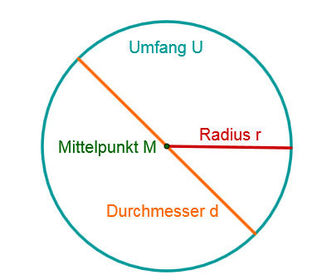 | Was ist der Durchmesser? | Die Länge einer Strecke zwischen zwei Punkten auf der Kreislinie, die durch den Mittelpunkt verläuft, heißt Durchmesser. Sie entspricht dem doppelten Radius: d=2r |