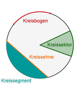 | Was ist der Kreissegment? | Eine Teilfläche des Kreises, die von der Kreislinie und einer Sehne begrenzt wird, nennt man Kreissegment bzw. Segment. |