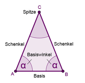 | Welche Bezeichnungen gibt es bei dem Gleichschenkligen Dreieck? | Die zwei gleich langen Seiten heißen Schenkel. Die dritte Seite nennt man Basis. Der Punkt gegenüber der Basis heißt Spitze. Die beiden Winkel an der Basis nennt man Basiswinkel. |