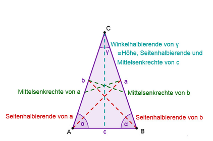 | Welche Eigenschaften hat das Gleichschenklige Dreiecik? (7 Punkte) | Die Basiswinkel sind gleich groß. Die Höhe , Seitenhalbierende und Mittelsenkrechte der Basis, sowie Winkelhalbierende der Spitze sind gleich. Es ist achsensymmetrisch zur Mittelsenkrechte der Basis Die Seitenhalbierenden der Schenkel sind gleich lang. Die Mittelsenkrechten der Schenkel sind gleich lang. Die Höhen an den Ecken der Basis sind gleich lang. Die Winkelhalbierenden der Basiswinkel sind gleich lang. |