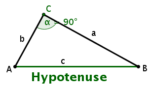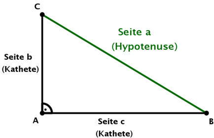 | Muss c immer die Hypothenuse sein? | Wenn - wie es oft gezeichnet wird - bei C der rechte Winkel ist, dann ist die Seite c (d. h. die Seite gegenüber vom Punkt C) die Hypotenuse (vgl. Bild oben). Wenn aber bei A der rechte Winkel ist, dann ist die Seite a (gegenüber von A) die Hypotenuse, und wenn er bei B ist, ist b die Hypotenuse. |