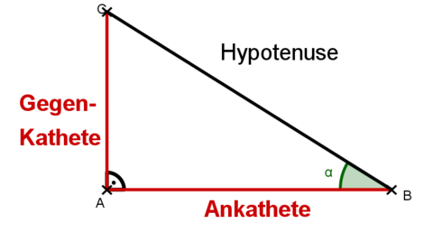 | Was sind Ankathete und Gegenkathete? | Betrachtet man einen der spitzen Winkel im rechtwinkligen Dreieck, kann man diesem eine Ankathete und eine Gegenkathete zuordnen. Die Ankathete ist die Kathete, welche direkt am Winkel anliegt, die Gegenkathete jene, die dem Winkel direkt gegenüber liegt. |