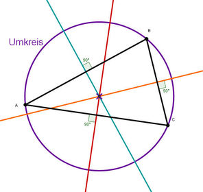 | Was ist der Umkreis? | Der Umkreis eines Dreiecks, ist der Kreis, der durch die 3 Eckpunkte geht. Der Mittelpunkt des Umkreises ist der Schnittpunkt der Mittelsenkrechten. |