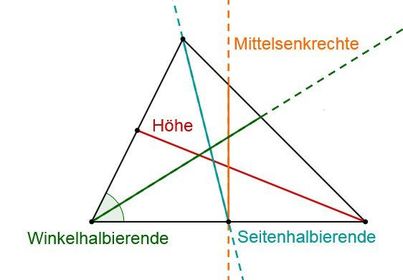 | Welche besondere Linien gibt es in einem Dreieck? | In jedem Dreieck gibt es 4 wichtige Geraden. Jede dieser Geraden kommt je Seite/Winkel einmal vor: Höhengerade Mittelsenkrechte Seitenhalbierende Winkelhalbierende |