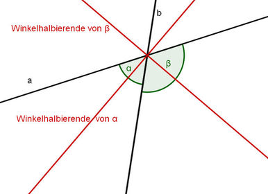 | Was ist eine Winkelhalbierende? | Die Winkelhalbierende eines Winkels ist ein Strahl, der im Scheitelpunkt eines Winkels entspringt und den Winkel in zwei gleiche Teile teilt. Ein sich schneidendes Geradenpaar bestimmt zwei Winkelhalbierende, die zueinander orthogonal sind. Hier im Bild schneiden sich die Geraden a und b in den Winkeln α und β. Die Winkelhalbierenden eines Dreiecks schneiden sich in einem Punkt, der gleichzeitig der Mittelpunkt des Inkreis ist. |