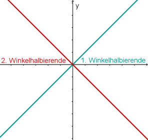 | Wie sind die Winkelhalbierenden in einem kartesischen Koordinatensystem? | In einem kartesischen Koordinatensystem sind die beiden winkelhalbierenden Geraden , wie im Bild rechts definiert. |