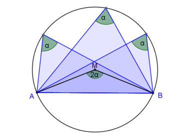 | Was ist der Randwinkelsatz? | Hintergrund für den Fasskreis ist der Randwinkelsatz, der garantiert, dass der Winkel α , unter dem man die Strecke [AB] sieht, auf allen Punkten des Kreisbogens gleich ist. Der Winkel AMB heißt Mittelpunktswinkel. Die anderen Winkel heißen Randwinkel. Der Mittelpunktswinkel ist immer doppelt so groß wie jeder Randwinkel. |