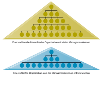 | Flache Organisationshierarchie mit vielen Managementebenen oder eine verflachte Organisation aus der Managementebenen herausgenommen wurden. | |