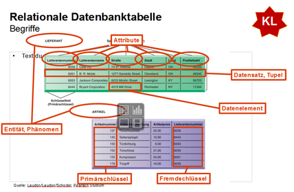 | Attribut | Der Name oder das Alter einer Person, eine Gruppe miteinander in der Beziehung stehenden Datenenelementen, Attribute der selben Entität bilden zusammen einen Datensatz. |