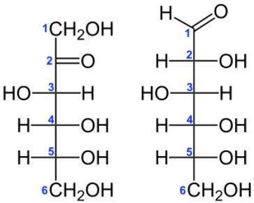 | Unterschied Ketose (links) und Aldose (rechts) |