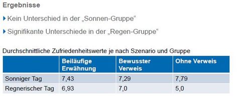 | Stimmung und Kontext | Personen beurteilen in schön eingerichteten Räumen ihre generelle Lebenszufriedenheit besser, währen die Zufriedenheit mit der eigenen Wohnsituation sinkt, umgekehrt ist es in ungemütlichen Räumen. (Vergleichsprozess vs Stimmung als Information) |