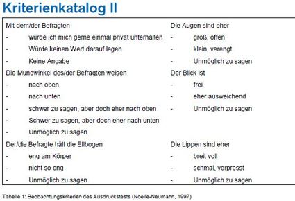| Kriterienkatalog von Elisabeth Noelle-Neumann | Katalog beruht auf der Annahmen, dass "Sprache der Physiogonomie kulturübergreifend ist" -Körpersprache international u unabhängig von Unterschieden in Sprache, Kultur, Kontext -stimmt das??? |