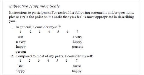 | Oxford Happiness Inventory | Skala 1-6, 1= strongly disagree, 6= strongly agree -mit positiven und negativen aussagen -am ende negative aussagen, zahlen umdrehen - alles addieren und durch 29 teilen, tada! |