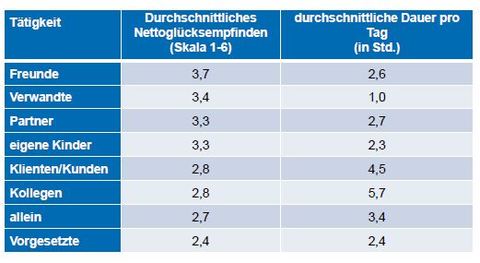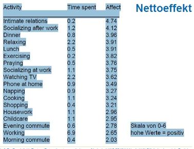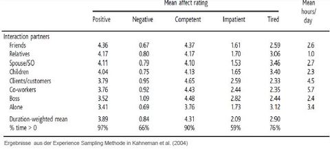 | Freundschaft im Arbeitsleben | Gute Kontakte auf der Arbeit erleichtern den Job Doppelt so viel Zeit wie mit Freunden (2.6 Std.) wird mit Kollegen (5.7) verbracht! (vgl. Studie von Kahneman, 2004) --> Verstehen wir uns gut mit unseren Mitarbeitern und Kollegen, wertet das den Job enorm auf -->Dies beeinflusst die allgemeine Lebenszufriedenheit |