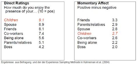 | Elternglück? | Veränderungen in den Lebensgewohnheiten der Eltern nach Geburt des ersten Kindes -Je jünger die Mütter und je geringer das Einkommen, desto schwerer wiegen die Veränderungen -Wer keine Kinder aufzieht, ist glücklicher -Empty-Nest-Syndrom ist ein Fehlschluss -Aber auch: „Elternschaft, eine der vielen Optionen von Menschen, beglückt um so mehr, je überzeugter sie gewollt ist“ |