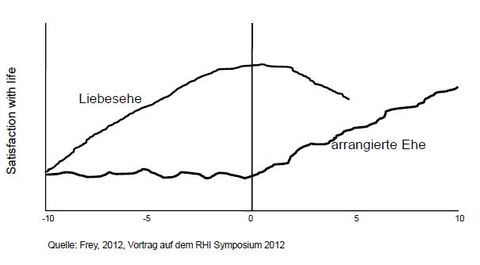 | Partenerschaft und Ehe | Heutzutage wird die Ehe aus persönlichen und nicht mehr wirtschaftlichen Gründen eingegangen (westliche Welt). Paarglück & Individualismus Menschen in einer festen Partnerschaft und Verheiratete sind glücklicher als Singles (Layard, 2005; Frey & Stutzer, 2002; Bucher, 2009) Direkt nach der Hochzeit sind sowohl Männer als auch Frauen glücklicher. Dieser Effekt hält jedoch nicht ein Leben lang an! (Rückkehr zum persönlichen Setpoint of Happiness) |