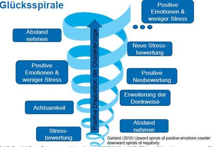 | Glück baut auf | Glück und Freude erweitern das Handlungspotenzial und bauen glückserhaltende Ressourcen auf a) Männern und Frauen werden visuelle Grafiken gezeigt, die mehrdeutig gesehen werden können. Diejenigen mit glücklicher Stimmung, nahmen schneller und häufiger mehrere Bedeutungen wahr. Erweiterung des Denkrepertoires & Sinneswahrnehmung b) Glückliche Menschen können sich besser entspannen als Unglückliche / Verängstigte; Negative Emotionen provozieren zu aggressivem Verhalten in jeder Lebenssituation, Positive zu Unternehmungen, Spontanität, Lebensfreude (Gottmann, 1994 |