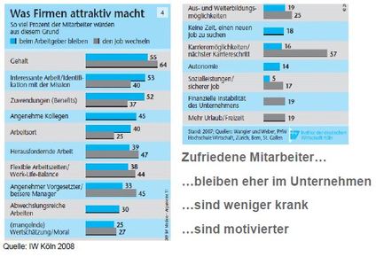 | Glück + Nutzen fürs Unternehmen | Demographischer Wandel: zunehmende Probleme gut qualifiziertes Personal zu bekommen. Gutes Gehalt alleine reicht als Anreiz nicht mehr aus: Rahmenbedingungen müssen stimmen. Wichtigstes Motiv für familienfreundliche Maßnahmen: „ (…) um qualifizierte Mitarbeiter zu halten oder zu gewinnen.“ Betriebswirtschaftlich interessant! Familienfreundliche Maßnahmen senken Kosten: geringere Fluktuation, niedrigerer Krankenstand, höhere Produktivität |
