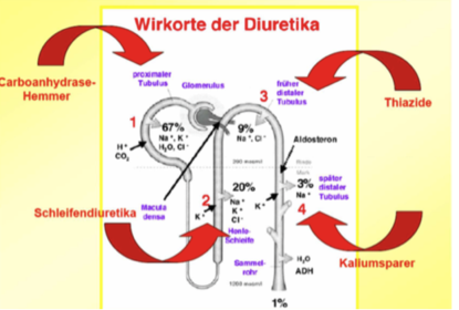 | Diuretika arten (5) | Schleifendiuretika, Thiazide, potentest Carbonanhydrasehemmer, Kaliumsparende Diuretika, Aldosteron Antagonisten Osmodiuretika |