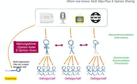 | Two Step Flow of Communication Faktoren: (Who one is What one knows Whom one knows) | Medien (geben Thema vor) | (Information) Meinungsführer (bestimmen Einstellung) | (IPK) Gefolgschaft (folgt) |