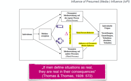 | Third Person Effect | Medieninhalte beeinflussen alle anderen, aber nicht mich (andere stärker als mich) anonyme Allgemeinheit stärker betroffen als unmittelbares Umfeld |