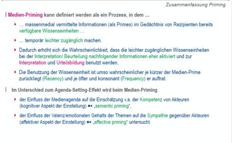 | Medien-Priming | Effekt, dass Mediennutzer Akteure nach Kriterien beurteilen, die aktuell in der Medienagenda verstärkt thematisiert werden Kann auch Einfluss auf Faktoren wie die Wahlabsicht haben |