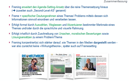 | Framing | Medien setzen einen Rahmen um ein Thema --> bestimmte Aspekte des Themas, die außerhalb des "Frames" liegen, werden gar nicht berücksichtigt und andere besonders hervorgehoben |