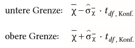Berechnung der oberen und unteren Grenze des Konfidenzintervalls mittels der t-Verteilung bei Mittelwerten | |