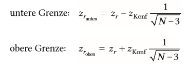 Konfidenzintervalle für Korrelationskoeffizienten bei Zusammenhänge | werden meist nicht berechnet, wenn über z-Verteilung Ablauf: Korrelationskoeffizient in z-Wert umrechnen -> kritischer Wert für Intervallgrenzen ablesen --> Grenzen berechnen (siehe Formel) --> Umrechnung auf Korrelationskoeffizient |