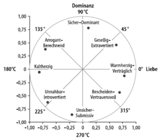 ... | Darstellung der interpersonellen Stile durch 2D Zirkumplexmodell. - jeder interpersonelle Stil lässt sich durch Kombination der Achsen beschreiben - Punkte geben empirisch geschätze Lage an, wenn Kreis in 8 Segmente zerlegt und jedes Segment durch eine Persönlichkeitsskala aus 8 Items erfasst. - Liebe entspricht ungefähr Verträglichkeit (Big Five) - Extraversion und interpersonelle Stile leicht beobachtbar, daher stimmen Selbst- u. Fremdurteil gut überein - Verträglichkeit hat auch 6 Facetten |