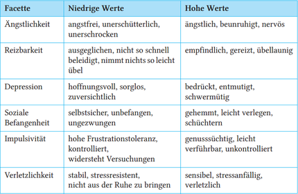 2.2 Neurotizismus | - Untergliederung in 6 Facetten nach NEO-PI-R - Hohe Werte von Neurotizismus sozial unerwünscht - Empfindlichkeit neurotischer Personen oft als interessant-schillernd wahrgenommen. - Situationsunspezifische Ängstlichkeit korreliert sher hoch mit Gesamtwert Neurotizismus, dass kaum von allgemeiner Ängstlichkeit unterscheidbar Unterscheidung in Facetten: soziale Ängstlichkeit, körperbezogene Ängstlichkeit soz. Ängstlichkeit: - auch soziale Gehemmtheit - äußert sich mit transsituativer Konsistenz: 1. gegenüber Fremden 2. in großen Gruppen, wenn man im Mittelpunkt steht 3. gegenüber Autoritäten -> geht oft mit Introversion einher |