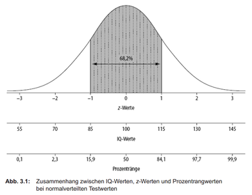3.1 Intelligenz | - Erfindung Intelligenztest: Binet und Henri (1895) -> Reihe von Aufgaben, deren Lösung jeweils untersch. intellektuelle Fähigkeiten widerspiegelt. - Bestimmung Inteligenzalter: so lange Aufgaben niedrigerer Altersstufen vorgelegt bis gerade noch alle gelöst werden konnten, dann weiter testen bis keine mehr gelöst wird. IA = GA + 12 * k/n GA = Grundalter (alle Aufgaben gelö.) , k = Zahl zusätzlich gelöster Aufgaben, n = Zahl zusätzlicher Aufgaben pro Alterstufe Intelligenzalter wurde dann mit Lebensalter verglichen. Stern schlug die Einführung des Quotienten vor: IQ = 100* IA / LA LA = Lebensalter >> nur für Messung bei Kindern geeignet Wechsler normierte 1939 die Testergebnisse für jede Altersstufe. IQ = 100 + 15 * z z = z-Wert von x (Rohwert) So normiert, dass Mittelwert 100 und SD = 15 |