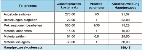 | Aufteilung der Prozesse in (Teil-)Mengen Prozessmengenplanung | Hauptprozess: Material beschaffen Cost Driver: 3600 Material Beschaffung Teilprozesse: Angebote einholen, Bestellung aufgeben, ... Kostenstelle: Einkauf (unterschiedlich je Teilprozess) Prozessparameter: 1/3, 1, ... Maßgröße Teilprozess: 1.200 Angebote, 3.600 Bestellungen, ... |