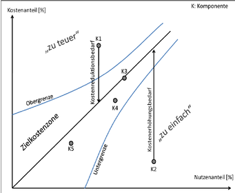 | Target-Costing Aufteilung des Produktes in Baugruppen | Einteilung und Gewichtung z. B. in B1 Karosserie, B2 Bremssystem, B3 Motor, ... |