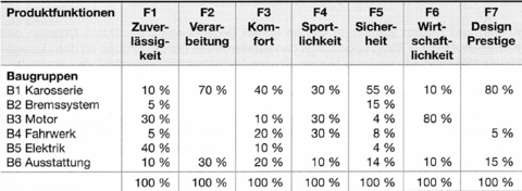 | Target-Costing Zurordnung des Beitrags der Baugruppen zu den Produktionsfunktionen | |