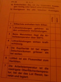 | 1= falsch Silberlote enthalten bis zu 50% silber Ag 2= richtig 3= falsch Beim weichlöten liegt die arbeitstemperatur unter 450° C 4= Falsch Lötverbindungen wirken stoffschlüssig 5= richtig 6= falsch Lötfett ist ein Flussmittel zum weichlöten 7= richtig | |