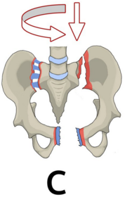 Typ C | Instabile Beckenringsfraktur mit Rotations- & Translationsinstabilität. Komplette Instabilität des hinteren Beckenrings, Rotationsinstabilität einer Beckenseite. |
