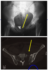Was ist eine Kontraindikation für eine Beckenzwinge? | Transiliacale Beckenschaufel- fraktur = "crescent fracture". Beim Einbringen der Pins: Penetration des Beckens! |