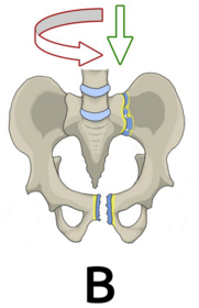 Typ B | Beckenringverletzung mit rotatorischem Stabilitätsverlust mit inkompletter Durchtrennung des hinteren Beckenrings und erhaltener vertikaler Stabilität -> Partiell instabil. Beeinträchtigte Stabilität im hinteren Beckenring, Rotationsstabilität einer Beckenseite. |