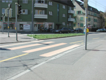 | Welche Massnahmen sind ersichtlich? Zweck? Wem bringt es was? | 1. Taktiles Signal an LSA 2. Bordsteinabsenkungen 1. Zusatzgerät an LSA für Sehbehinderte 2. Querungshilfe für alle Mobilitätsbehinderte --> muss für Blinde aber noch ertastbar sein! |