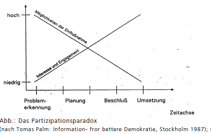 | Mitwirkung: Risiken von Mitwirkungsverfahren | · Zielverlagerung von „Planungskonsistenz“ zu “Planungsakzeptanz“ · Übergewicht organisierter und konfliktfähiger Akteure · Verstärkung sozialer Beteiligungsunterschiede bei fachspezifischer Kommunikation · Übervertretung sozial höherer Schichten bei komplexen Problemlagen · Keine Akzeptanz aller konfliktfähiger Gruppierungen · Späterer Vollzugswiderstand unbeteiligter Behörden, Gruppen oder Personen · Hohes Konfliktpotential durch heterogene Zusammensetzung · Gefahr unverbindlicher Diskussionsrunden · Uneffektivität infolge Energieverschleiss in interne Macht- oder Fachkämpfe |