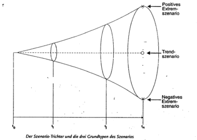 | Mitwirkung: Szenariendiskussion was stellt der Trichter dar? | Komplexität und Unsicherheit werden grösser, je weiter man vom Ausgangszustand t (o) entfernt denkt. Die Planungshorizonte t(i) bis t(n) stehen für kurz-, mittel- und langfristig. |