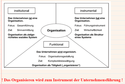 | Aufbauorganisation | Die Aufbauorganisation beschreibt die auf Dauer angelegte, von außen sichtbare Konfiguration eines Unternehmens. - Aufbau und Organisation der Unternehmensstruktur -> eher statisch - Organisatorische Differenzierung - Organisatorische Integration => es geht um Hierarchien/ Strukturen in der Unternehmensorganisation - Interdependenzen zwischen Aufbau- und Ablauforganisation |