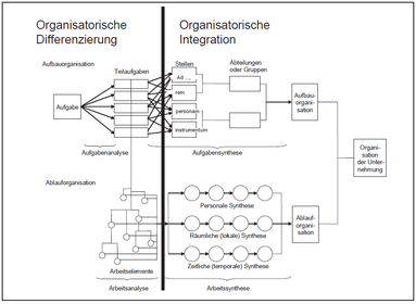 | Ablauforganisation | Ablauforganisation bezeichnet in der Organisationstheorie das Beschreiben von dynamischen Arbeitsprozessen unter Berücksichtigung von Strukturen für Raum, Zeit, Sachmitteln und Personen => es geht um Prozesse (Abläufe) -> logische Abfolge von Arbeitsschritten => Interdependenzen zwischen Aufbau- und Ablauforganisation - Ablauforganisation eher dynamischer |