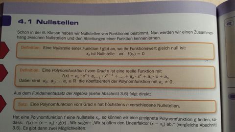 | Wie viele Nullstellen kann eine Polynomfunktion n-ten Grades max. haben? | Eine Polynomfunktion vom Grad n hat höchstens n verschiedene Nullstellen. |