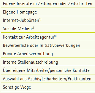 | Bewerbungswege | Stellenanzeigen, Arbeitsargentur, Direktansprache, Bewerbermessen, persönliche Kontakte, Praktika, Internet |